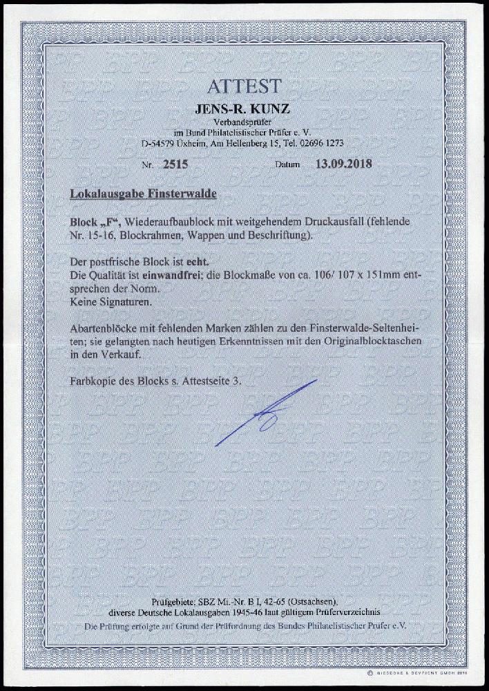 | Zusatzinformationen und Suchstichworte: | DBA Freiburg GmbH Los 1444400387 D Deutsche Lokalausgabe Finsterwalde 1946, Blockausgabe Wiederaufbau in postfrischer Originalgröße und Luxuserhaltung mit der äußerst attraktiven Abart "weitgehender Druckausfall - fehlende MiNr. 15-16, Blockrahmen, Wappen und Beschriftung". Signiert und aktuelles Farbfotoattest Kunz BPP vom 13.09.2018 "... echt und einwandfrei.... Abartenblöcke mit fehlenden Marken zählen zu den Finsterwalde- Seltenheiten, sie gelangten nach heutigen Erkenntnissen mit den Originalblocktaschen in den Verkauf... ". Diese Variante ist nicht im Michel- Spezial 2021 gelistet! Festpreis 2.200,00 EUR |