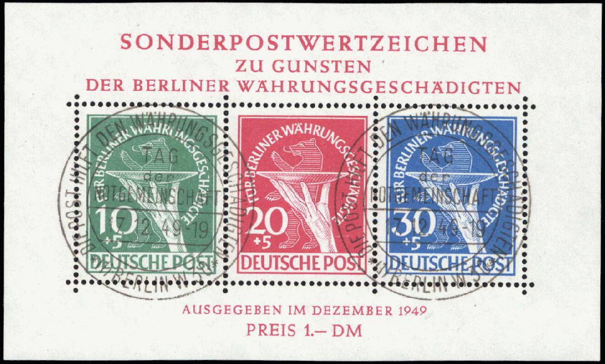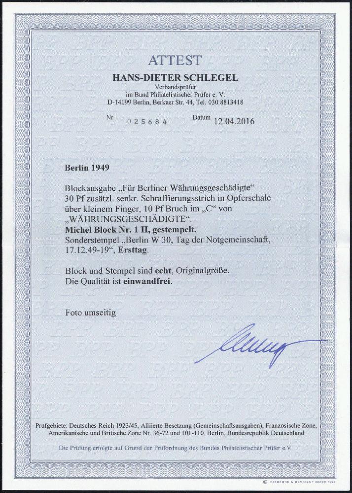 | Zusatzinformationen und Suchstichworte: | DBA Freiburg GmbH Los 1021200110 Berlin 1949, Blockausgabe "Währungsgeschädigte" in Originalgrösse mit 2 glasklaren Ersttags- Sonderstempel und dem Plattenfehler bei der 10 Pfg.-Marke "Bruch im C" und bei der 30 Pfg.-Marke "zusätzliche Schraffierungslinie" in Luxuserhaltung. Aktuelles Farbfotoattest Schlegel BPP vom 12.04.2016 in der höchsten Qualitätsstufe ohne Einschränkung "...echt und einwandfrei...." (ME 3.500.-) Festpreis 1.700,00 EUR |