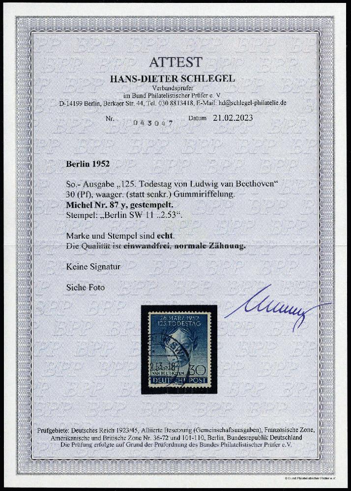 | Zusatzinformationen und Suchstichworte: | DBA Freiburg GmbH Los 1021400175 Berlin 1952, 30 Pfg. Ludwig van Beethoven in gestempelter Luxuserhaltung in der seltenen Type "y" in der für diese Ausgabe normalen Zähnung. Aktuelles Farbfotoattest Schlegel BPP vom 21.02.2023 "echt und einwandfrei" Festpreis 1.500,00 EUR |