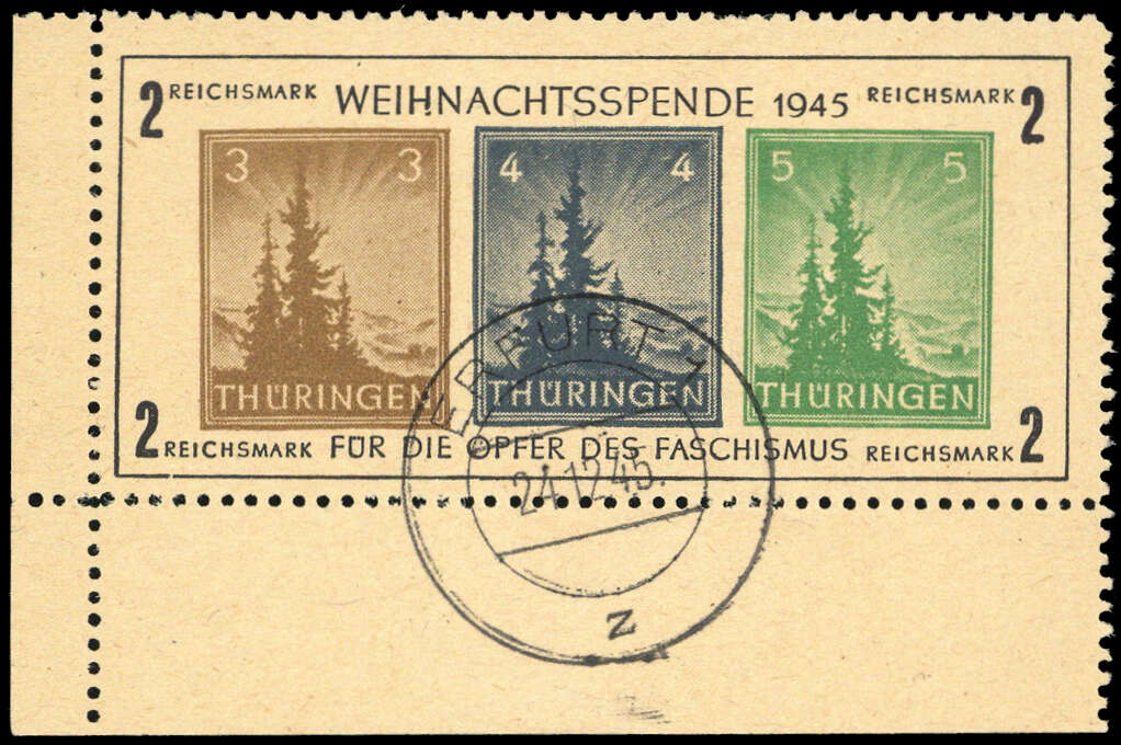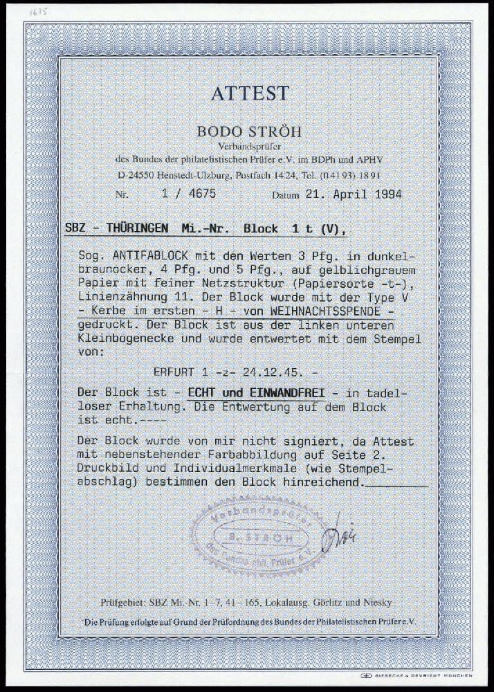 | Zusatzinformationen und Suchstichworte: | DBA Freiburg GmbH Los 1021400199 SBZ Thüringen 1945, Blockausgabe "Weihnachten" aus der Bogenecke links unten klar gestempelt am Weihnachtstag "24.12.45" in der besten Type "t" in einwandfreier Erhaltung, Fotoattest Ströh BPP ".... echt und einwandfrei ...." (ME 3.200.-) Festpreis 1.500,00 EUR |