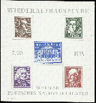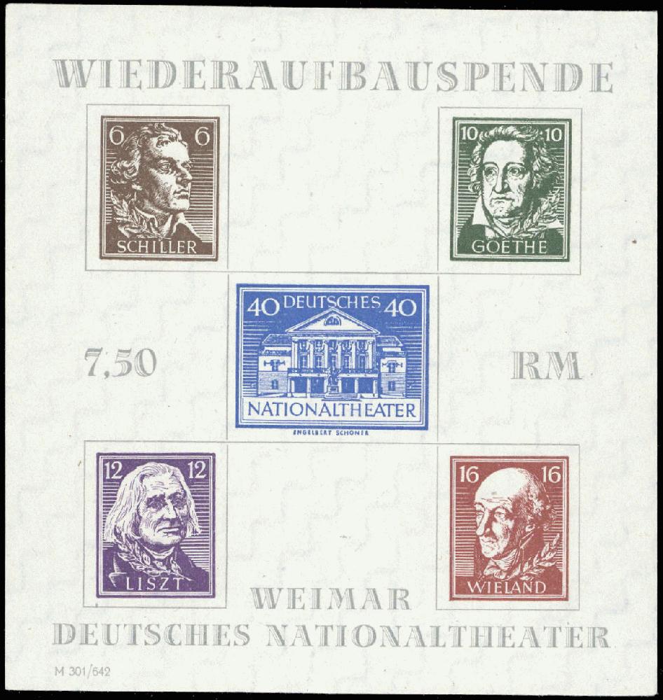 | Zusatzinformationen und Suchstichworte: | DBA Freiburg GmbH Los 1031400153 SBZ Thüringen 1946, Blockausgabe "Wiederaufbau des Deutschen Nationaltheaters Weimar" auf, wie verausgabt, ungummiertem Papier hergestellt mit der sehr seltenen Wasserzeichenabart "Stufen steil fallend" in der für diese Ausgabe normalen Größe 99,9 x 104,9 mm mit einem kleinen Eckbug, aktuelles Farbfotoattest von dem Experten Dr. Michael Jasch vom 03.03.2023 " .... echt ..... Weitere Einschränkungen sind nicht erkennbar ... ". Eine SBZ Rarität! (ME 25.000.-) Festpreis 8.500,00 EUR |