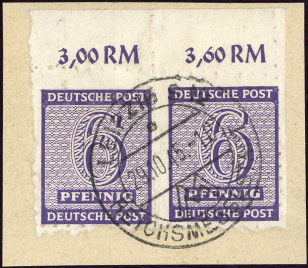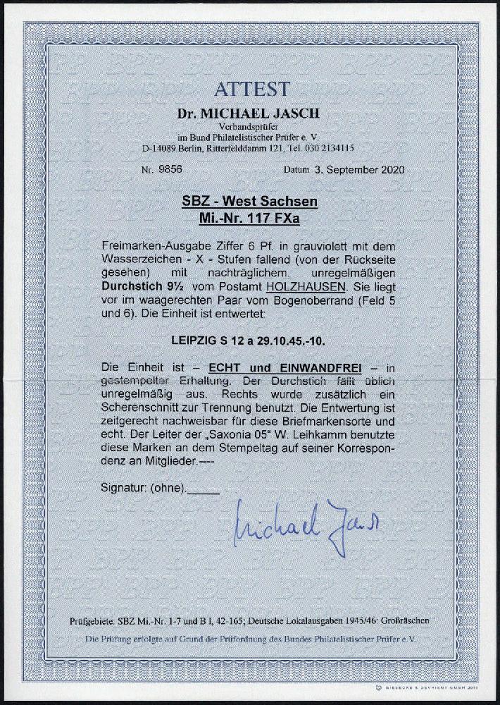 | Zusatzinformationen und Suchstichworte: | DBA Freiburg GmbH Los 1021200135 SBZ Westsachsen 1945, 6 Pfg. Freimarke Ziffer im dekorativen Oberrandpaar in der seltenen Type "FXa" mit Holzhausen- Durchstich auf einwandfreiem Briefstückchen, aktuelles Farbfotoattest Dr. Jasch BPP vom 03.09.2020 "echt und einwandfrei" (ME 4.600.-) Festpreis 2.200,00 EUR |