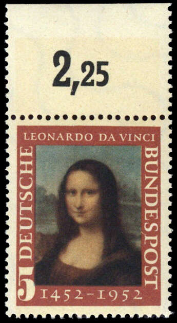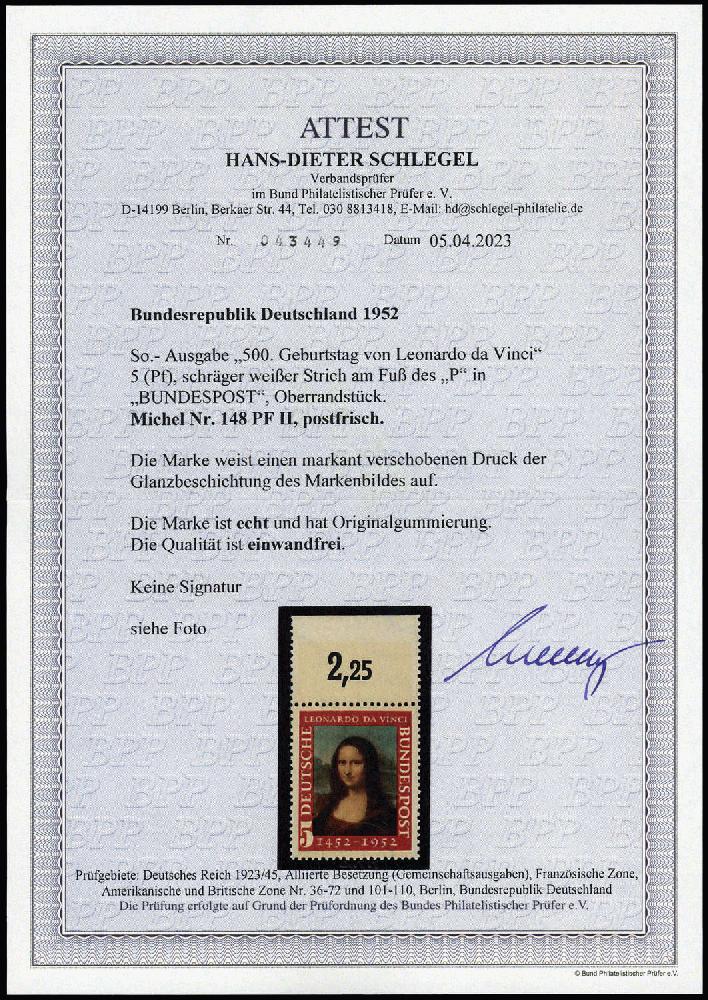 | Zusatzinformationen und Suchstichworte: | DBA Freiburg GmbH Los 1444400506 Bundesrepublik Deutschland 1952, 5 Pfg. Mona Lisa von Leonardo da Vinci vom Oberrand mit gleich zwei Besonderheiten. Zum ersten ist die Marke mit deutlich verschobenem Druck der Glanzbeschichtung - im Michel-Spezial 2023 ist dieses nicht notiert! Zum zweiten weist sie den Plattenfehler "Strich am Fuß des P" auf. In dieser Kombination vermutlich ein Unikat! Aktuelles Farbfotoattest Schlegel BPP vom 05.04.2023 "...echt und einwandfrei ...." Festpreis 1.500,00 EUR |