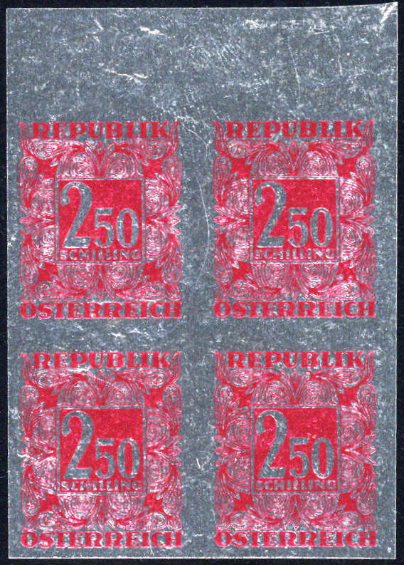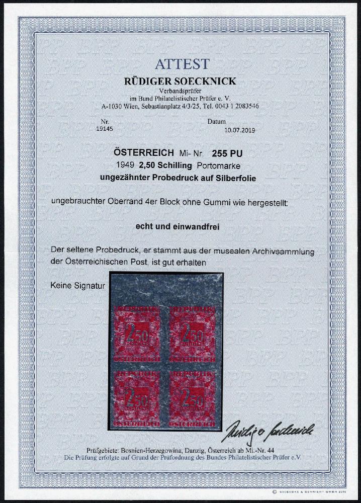 | Zusatzinformationen und Suchstichworte: | DBA Freiburg GmbH Los 1444400213 D Österreich 1949, 2.50 Schilling Portomarke als Luxus- Probedruck im ungezähnten Oberrand 4-er Block in der Farbe "rot" auf ungummierter Silberfolie hergestellt. Die Post versuchte neue Methoden für eine effektivere Beförderung von Briefen, wobei diese Marke in der Testphase entstanden ist - sehr außergewöhnlich. Aktuelles Farbfotoattest Soecknick BPP vom 10.07.2019 "...echt und einwandfrei. Der seltene Probedruck .... ist gut erhalten...." (ME 6.000.-) Festpreis 2.700,00 EUR |