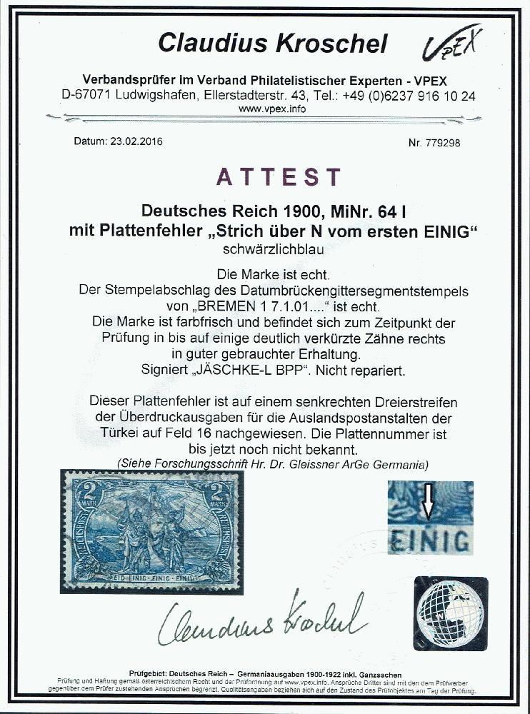 | Prüfer: | Kroschel, Claudius (VPEX (Verband Philatelistischer Experten)) |