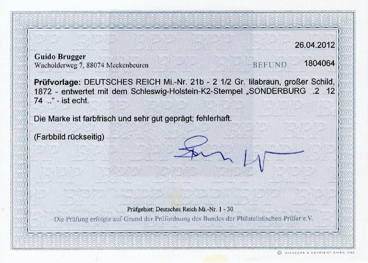 | Zusatzinformationen und Suchstichworte: | Veuskens Webshop Los 0001701722 Deutsches Reich, 1872 Grosser Brustschild 2 1/2 Gr. Großer Schild 1872, sauber mit entwertet mit K2. 'Sonderburg 2.12.74', mit Farbfotobefund Brugger BPP, feinst. M€ 700,-- Festpreis 89,90 EUR |