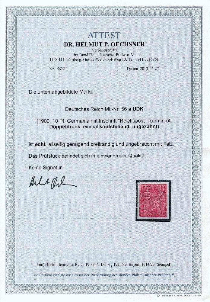 | Zusatzinformationen und Suchstichworte: | Veuskens Webshop Los 0001701727 Deutsches Reich, Germania Reichspost 10 Pf. Germania REICHSPOST 1900, mit seltener Abart 'Doppeldruck kopfstehend', ungezähnt, sauber ungebraucht mit Falzrest. Mit ausführl. Farbfotobefund Dr. Oechsner BPP, Kabinett. M€ 500,-- Festpreis 143,90 EUR |