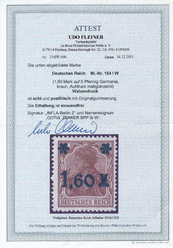 | Zusatzinformationen und Suchstichworte: | Veuskens Webshop Los 0001701734 Deutsches Reich, 1918/23 Inflationsausgaben 1,60 Mark auf 5 Pf. Germania 1921, Aufdruck mattglänzend, im Walzendruck, tadellos postfrisch, gepr. Infla-Berlin, Zenker und mit Farbfotoattest Fleiner BPP, Luxus. Selten. M€ 1.200,--++ Festpreis 239,90 EUR |