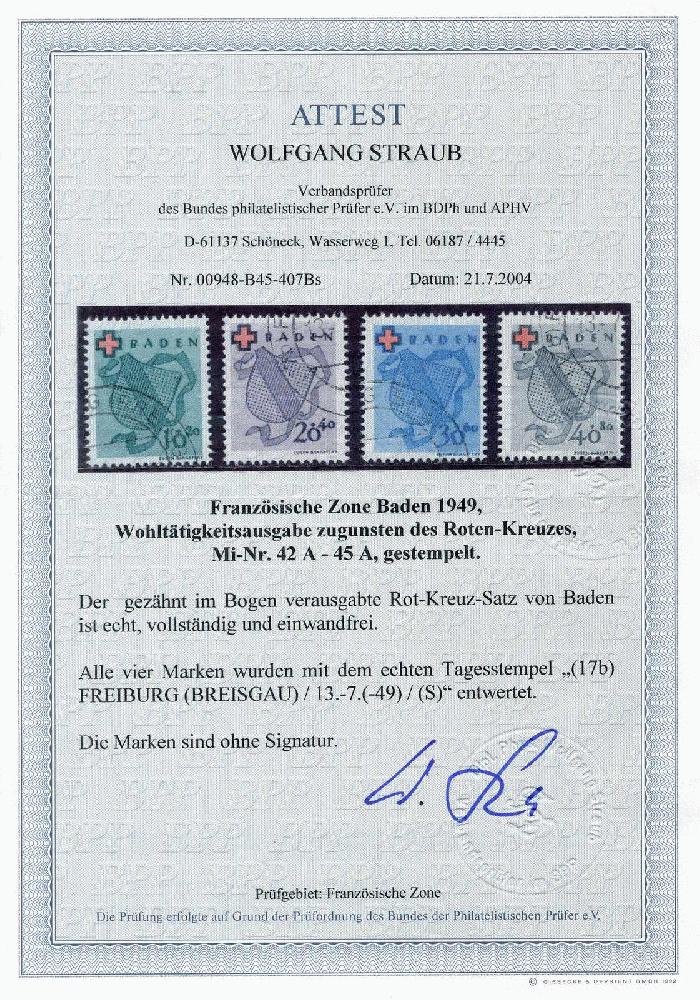 | Zusatzinformationen und Suchstichworte: | Veuskens Webshop Los 0001701870 Französische Zone Baden Rotkreuz-Satz 1949, sauber und schön gest. 'Freiburg 13.7.(49)', mit Fotobefund Straub BPP, Luxus. M€ 400,-- Festpreis 129,50 EUR |