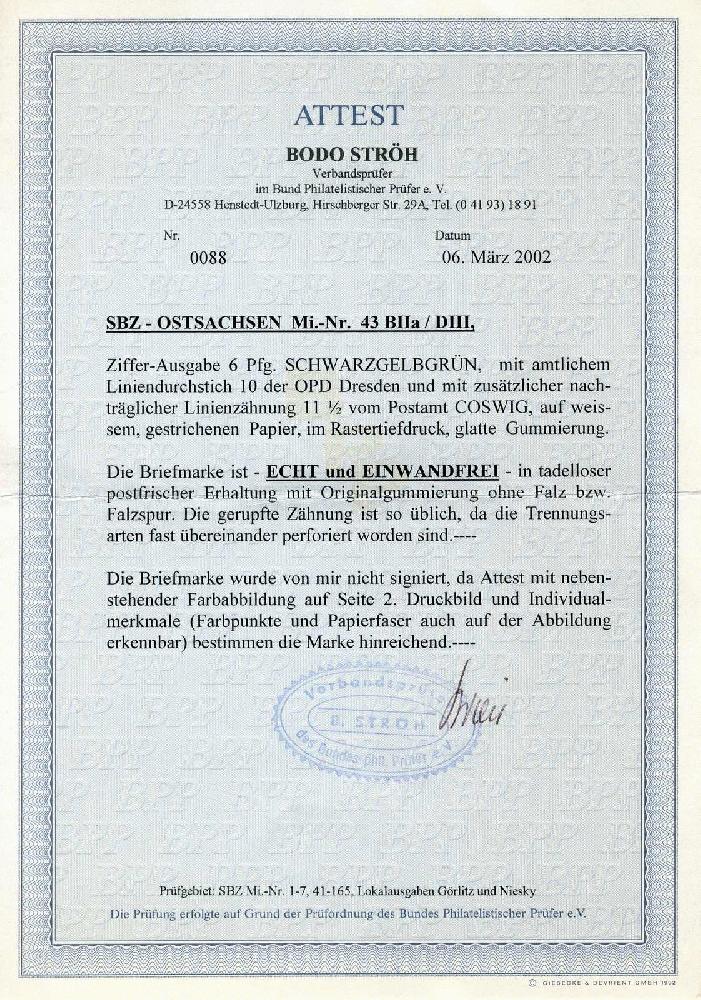 | Zusatzinformationen und Suchstichworte: | Veuskens Webshop Los 0001701791 SBZ Ostsachsen 6 Pf. Ziffer 1945, mit amtl. Linendurchstich der OPD-Dresden und zusätzl. nachträgl. Linienzähnung L 11 1/2 vom Postamt Coswig, tadellos postfrisch, Farbfotoattest Ströh BPP 'echt und einwandfrei', Pracht. M€ 1.000,-- Festpreis 215,90 EUR |