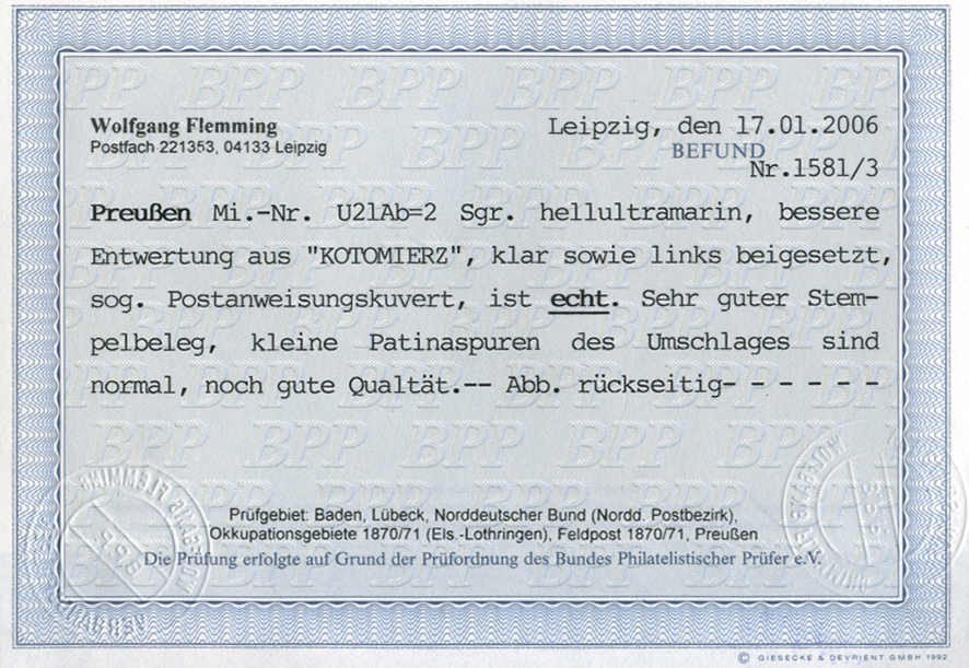 | Zusatzinformationen und Suchstichworte: | AAK Phila GmbH Los 1022500464 Altdeutschland Preussen KOTOMIERZ, besserer K2 2x klar a. 2 Sgr GAU m. Befund Flemming BPP "echt, sehr guter Stempelbeleg..., noch gute Qualität" Festpreis 29,99 EUR |