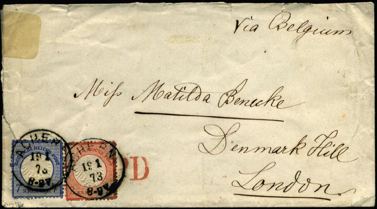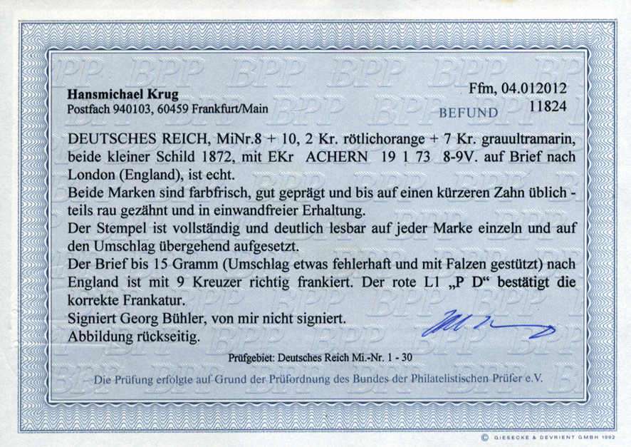 | Zusatzinformationen und Suchstichworte: | AAK Phila GmbH Los 1026000022 Deutsches Reich, 1872 Kleiner Brustschild 2 u. 7 Kr kl. Schild, portoger. MiF a. Umschlag (etwas fehlerhaft) v. Achern (2x K1) n. London/GB (AKS) m. Befund Krug BPP "echt, farbfrisch, gut geprägt, bis auf 1 kürzeren Zahn in einwandfreier Erhaltung", R Festpreis 139,99 EUR |