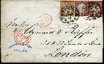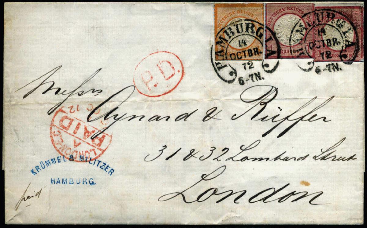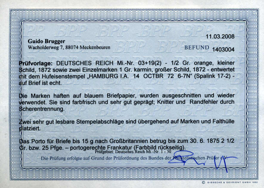 | Zusatzinformationen und Suchstichworte: | AAK Phila GmbH Los 1026000016 Deutsches Reich, 1872 Grosser Brustschild 1/2 Gr kl. u. 2x 1 Gr gr. Schild als portoger. MiF a. kpl. Faltbriefhülle v. Hamburg (2x Hufeisenstpl.) n. London (AKS) m. Befund Brugger BPP "echt, Marken haften auf blauem Briefpapier, wurden ausgeschnitten und wieder verwendet, farbfrisch, sehr gut geprägt, Randfehler durch Scherentrennung", ungewöhnliche Zweitverwendung! Festpreis 79,99 EUR |