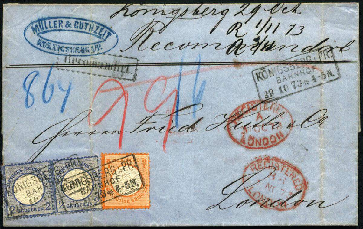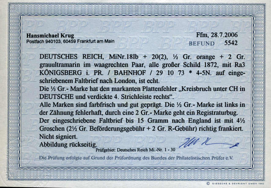 | Zusatzinformationen und Suchstichworte: | AAK Phila GmbH Los 1026000038 Deutsches Reich, 1872 Grosser Brustschild 1/2 Gr m. PF "Kreisbruch" u. 2 Gr gr. Schild waagr. Paar, portoger. MiF a. kpl. eingeschriebener Faltbriefhülle v. Königsberg (Ra3) n. London/GB (AKS) m. Befund Krug BPP "echt, farbfrisch, gut geprägt, 1/2 Gr li. fehlerhafte Zhg., 2 Gr m. Registraturbug", Markant! Festpreis 79,99 EUR |