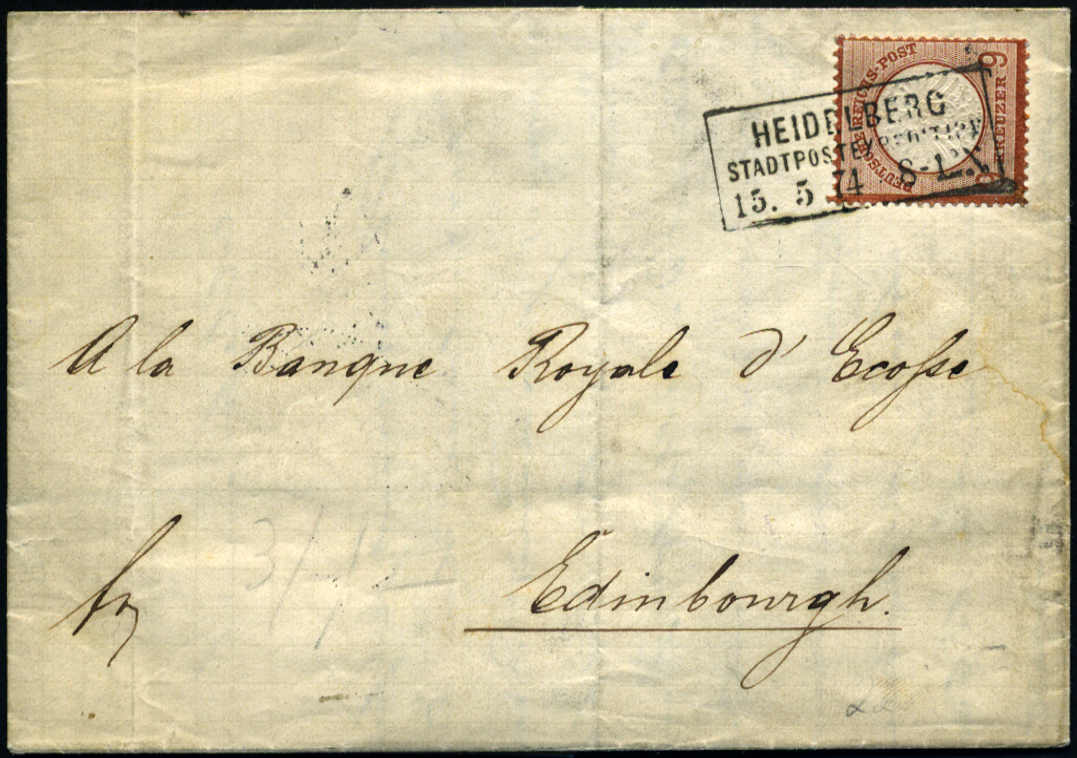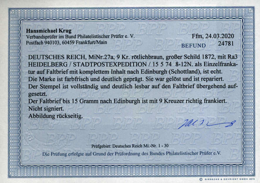 | Zusatzinformationen und Suchstichworte: | AAK Phila GmbH Los 1026000026 Deutsches Reich, 1872 Grosser Brustschild 9 Kr gr. Schild, portoger. EF a. kpl. Faltbf. v. Heidelberg (Ra3) n. Edinburgh/GB (AKS) m. Befund Krug BPP "echt, farbfrisch, deutlich geprägt, gelöst und repariert", seltene EF Festpreis 84,99 EUR |