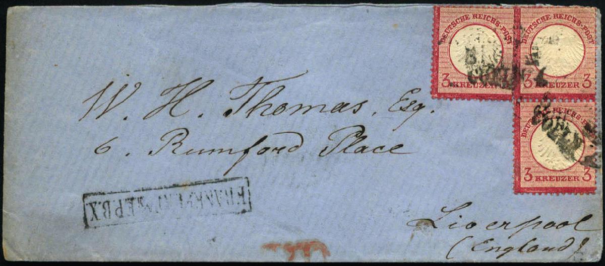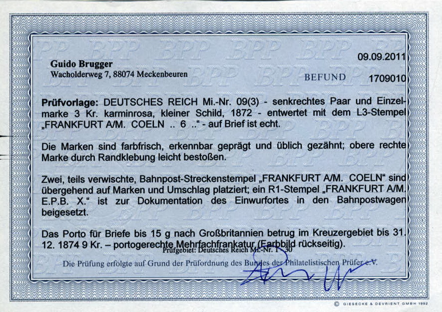 | Zusatzinformationen und Suchstichworte: | AAK Phila GmbH Los 1026000024 Deutsches Reich, 1872 Grosser Brustschild 3 Kr gr. Schild 3x (1x senkr. Paar) als seltene portoger. MeF a. kl. Umschlag per Bahnpost v. Ffm. n. Coeln n. Liverpool/GB (AKS), m. Befunden Krug u. Brugger BPP m. kleinsten Mängeln, R Festpreis 99,99 EUR |