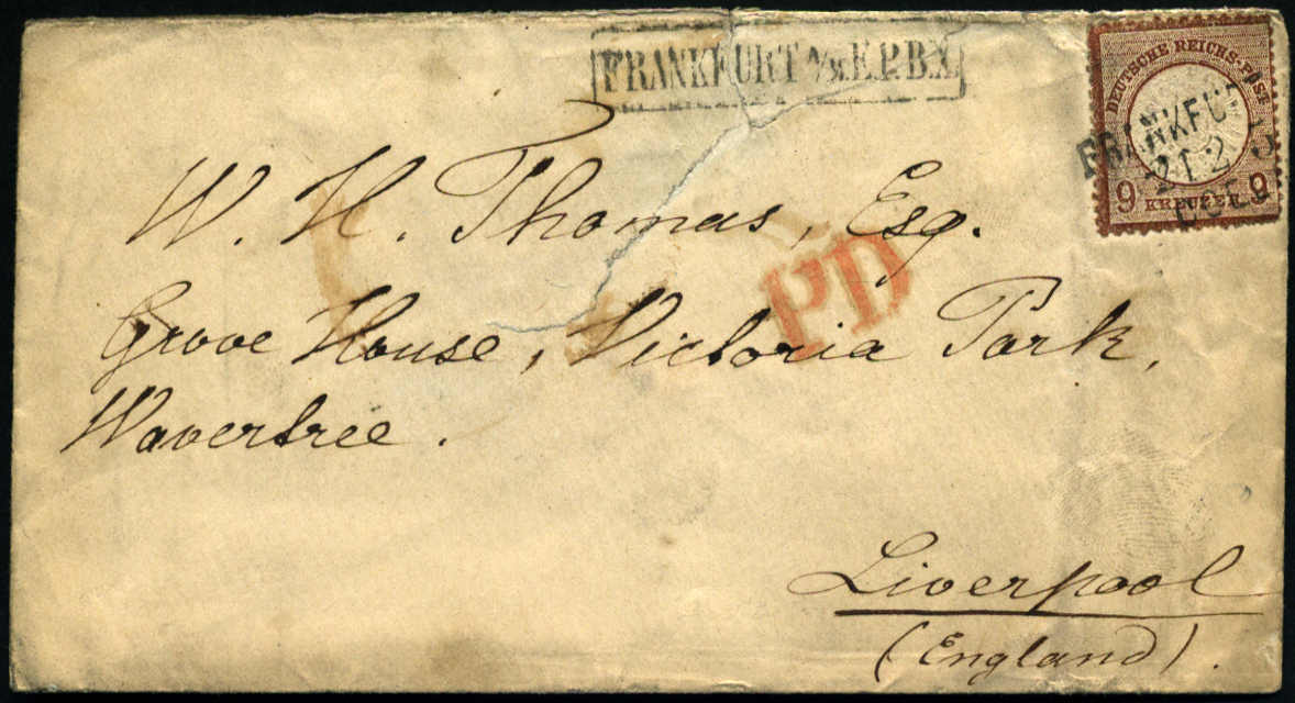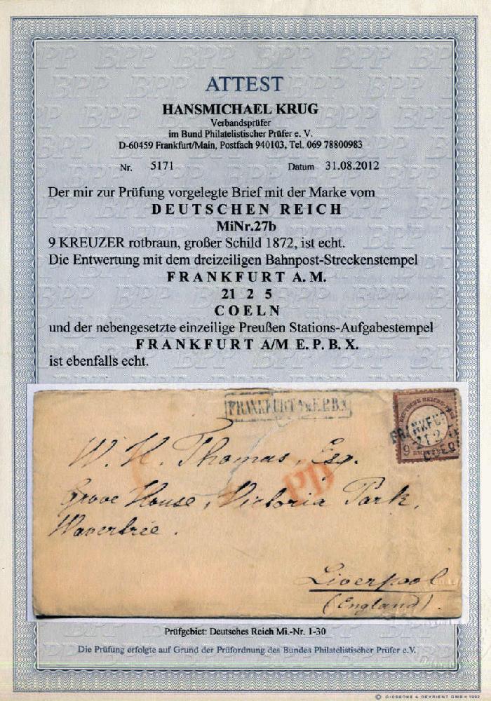| Zusatzinformationen und Suchstichworte: | AAK Phila GmbH Los 1026000027 Deutsches Reich, 1872 Grosser Brustschild 9 Kr gr. Schild in guter Farbe (dkl. Nuance), portoger. EF a. Umschlag (Mgl.) per Bahnpost v. Ffm. (nicht häufig) n. Liverpool/GB (AKS) m. FA Krug BPP "echt, farbfrisch, gut gezähnt, kurze Zähne, nicht häufiger Aufgabestpl.", RR Festpreis 239,99 EUR |