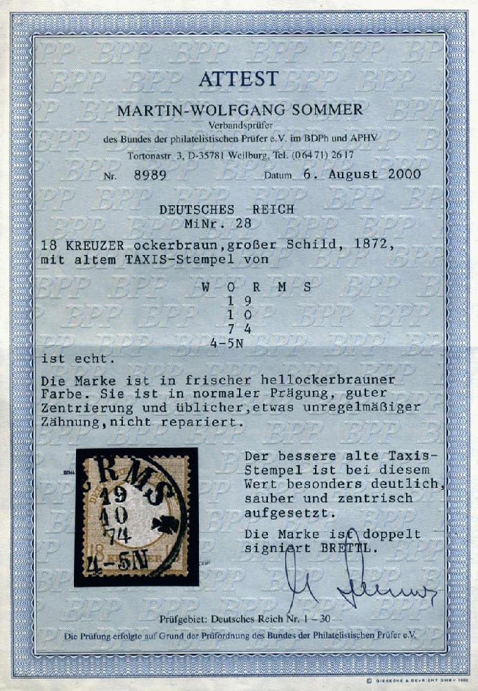 | Zusatzinformationen und Suchstichworte: | AAK Phila GmbH Los 1026001267 Deutsches Reich, 1872 Grosser Brustschild 18 Kr gr. Schild m. zentr. altem T&T-K1 Worms, doppelt tief gepr. Brettl und m. FA Sommer BPP "echt, frische hellockerbraune Farbe, normale Prägung, gut zentriert, übliche, etw. unregelm. Zhg., besonders deutlich gestpl.", schönes Stück! Festpreis 599,99 EUR |