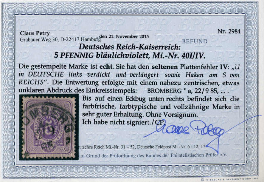 | Zusatzinformationen und Suchstichworte: | AAK Phila GmbH Los 1022501240 Deutsches Reich, 1880/89 Pfennig 5 Pf bläul´violett m. seltenem PF "U verdickt", zentr. rundgest. Pracht Bromberg m. ausführlichem Befund Petry BPP "echt,.. bis auf Eckbug re.u. in sehr guter Erhaltung", R Festpreis 39,99 EUR |