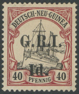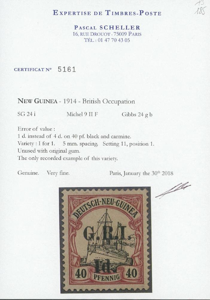 | Zusatzinformationen und Suchstichworte: | Ulrich Felzmann Shop Los 674180 Deutsche Kolonien Neuguinea Britische Besetzung 1 d. G.R.I. statt 4 d. G.R.I. auf 40 Pfennig Kaiseryacht, tadellos ungebrauchtes Kabinettstück dieser großen Rarität, Setting 1 Position 1 mit Variante "I anstatt 1", Fotoattest Kilian BPP, der die Variante des I anstatt 1 noch nicht aufführte sowie aktuelle Expertise Scheller der den Sachverhalt exakt beschreibt, das einzige bekannte Exemplar dieser Abart, SG 24i, Gibbs 24gb Festpreis 10.000,00 EUR |