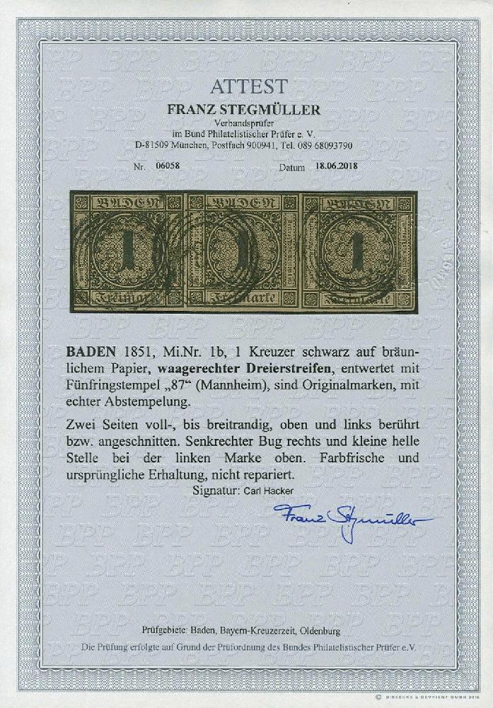 | Zusatzinformationen und Suchstichworte: | Ulrich Felzmann Shop Los 493966 Altdeutschland Baden "1 Kr auf braun, II. Auflage, farbfrischer, zweiseitig voll- bis breitrandiger, oben und links berührter bzw. angeschnittener waagerechter Dreierstreifen mit drei Abschlägen des Fünfringstempels ""87"" - MANNHEIM, senkrechter Bug rechts und kleine helle Stelle bei der linken Marke oben, Fotoattest Stegmüller BPP, € 1.200,-" Festpreis 150,00 EUR |