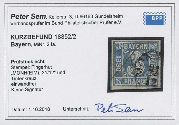 | Zusatzinformationen und Suchstichworte: | Ulrich Felzmann Shop Los 505646 Altdeutschland Bayern "3 Kr blau, Platte I, farbfrisches, allseits breitrandiges Kabinettstück mit Fingerhut-K1 aus MONHEIM 31/12 und Tintenkreuz, Fotokurzbefund Sem BPP ""einwandfrei""" Festpreis 70,00 EUR |