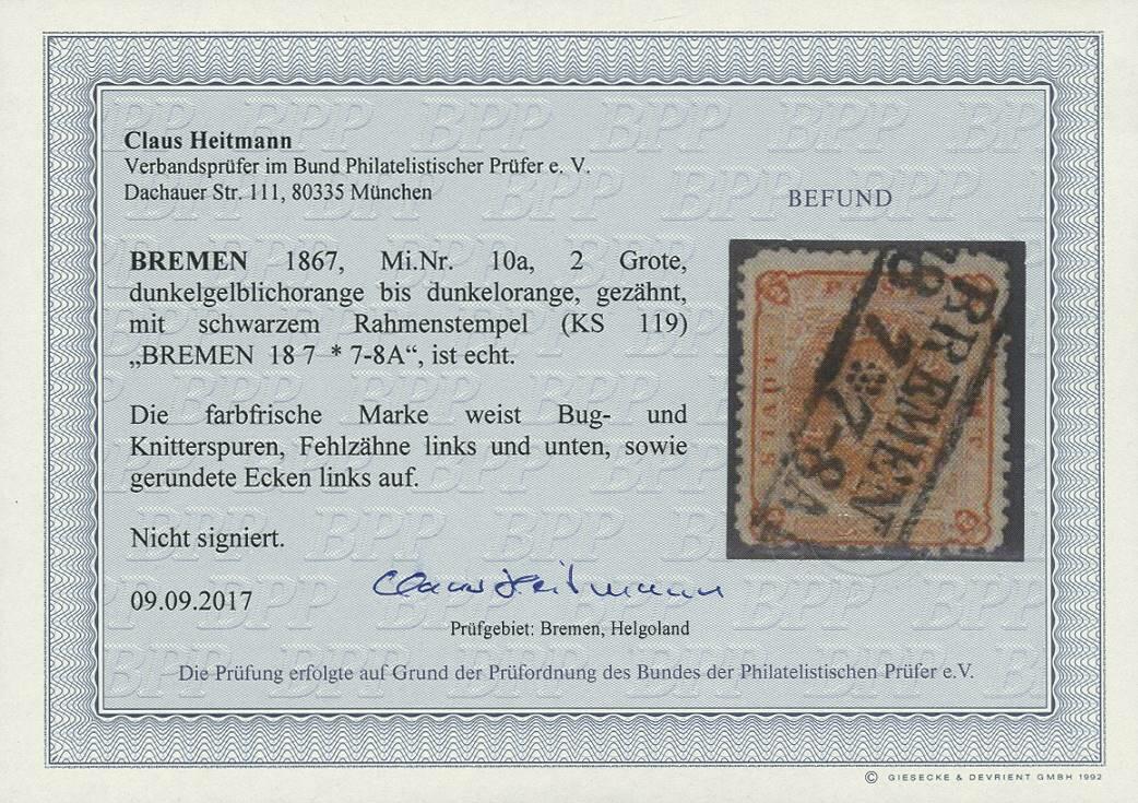 | Zusatzinformationen und Suchstichworte: | Ulrich Felzmann Shop Los 502523 Altdeutschland Bremen 2 Gr dunkelgelblichorange, farbfrisch und attraktiv mit diagonal klar aufgesetztem R2 BREMEN (KS 119), kleine Mängel, Fotobefund Heitmann BPP Festpreis 70,00 EUR |
