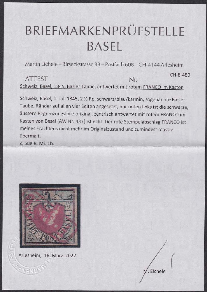 | Zusatzinformationen und Suchstichworte: | Luzernerraute Webshop Los 0000109075 KANTON BASEL BASLER TAUBE, Nr.8 mit rotem FRANCO. Optisch ansprechendes Stück mit jedoch starken Einschränkungen und Korrekturen. Trotz Mängeln faszinierende Marke für den Stempel-Sammler - selten schön diagonal aufgeschlagenes Stab-Franco. Buchpreis: 20'000.-+50% für Entwertung Festpreis 5.800,00 CHF |