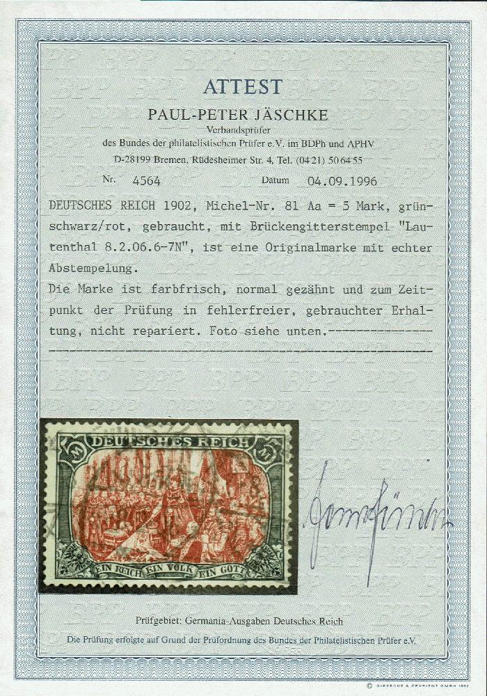| Prüfgebiet: | Deutsches Reich 1871 - 1918 (Mi-Nr. 1 - 106) |