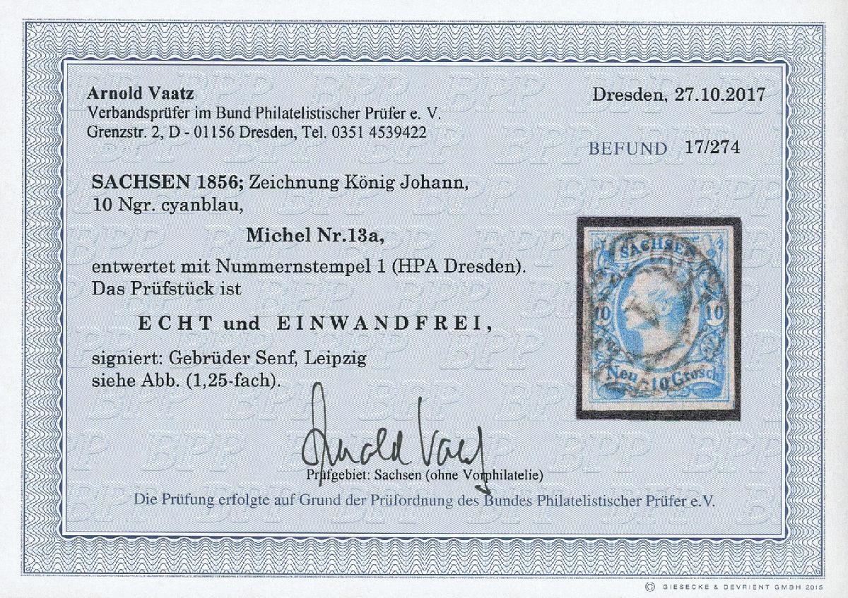 | Zusatzinformationen und Suchstichworte: | Wilhelm Sellschopp – Webshop Los 374 Altdeutschland Sachsen 10 Ngr. cyanblau, allseits breitrandig, zentrierter NS "1", fehlerfrei. FB Vatz. Aus Umzugsangebot abzgl. 10% Rabatt. Festpreis 180,00 EUR |