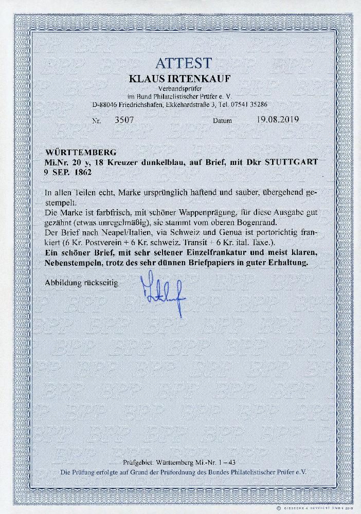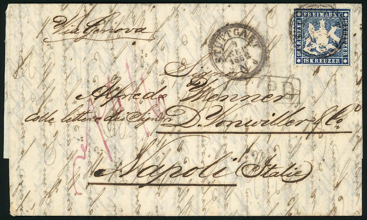 | Zusatzinformationen und Suchstichworte: | Wilhelm Sellschopp – Webshop Los 259 Altdeutschland Württemberg 18Kr. dunkelblau, sehr gut gezähnt, farbfrisch, einwandfrei. Sehr seltene EF auf Brief von Stuttgart über die Schweiz nach Neapel. Michel 7500,--. FA Irtenkauf. Aus Umzugsangebot abzgl. 10% Rabatt. Festpreis 4.800,00 EUR |