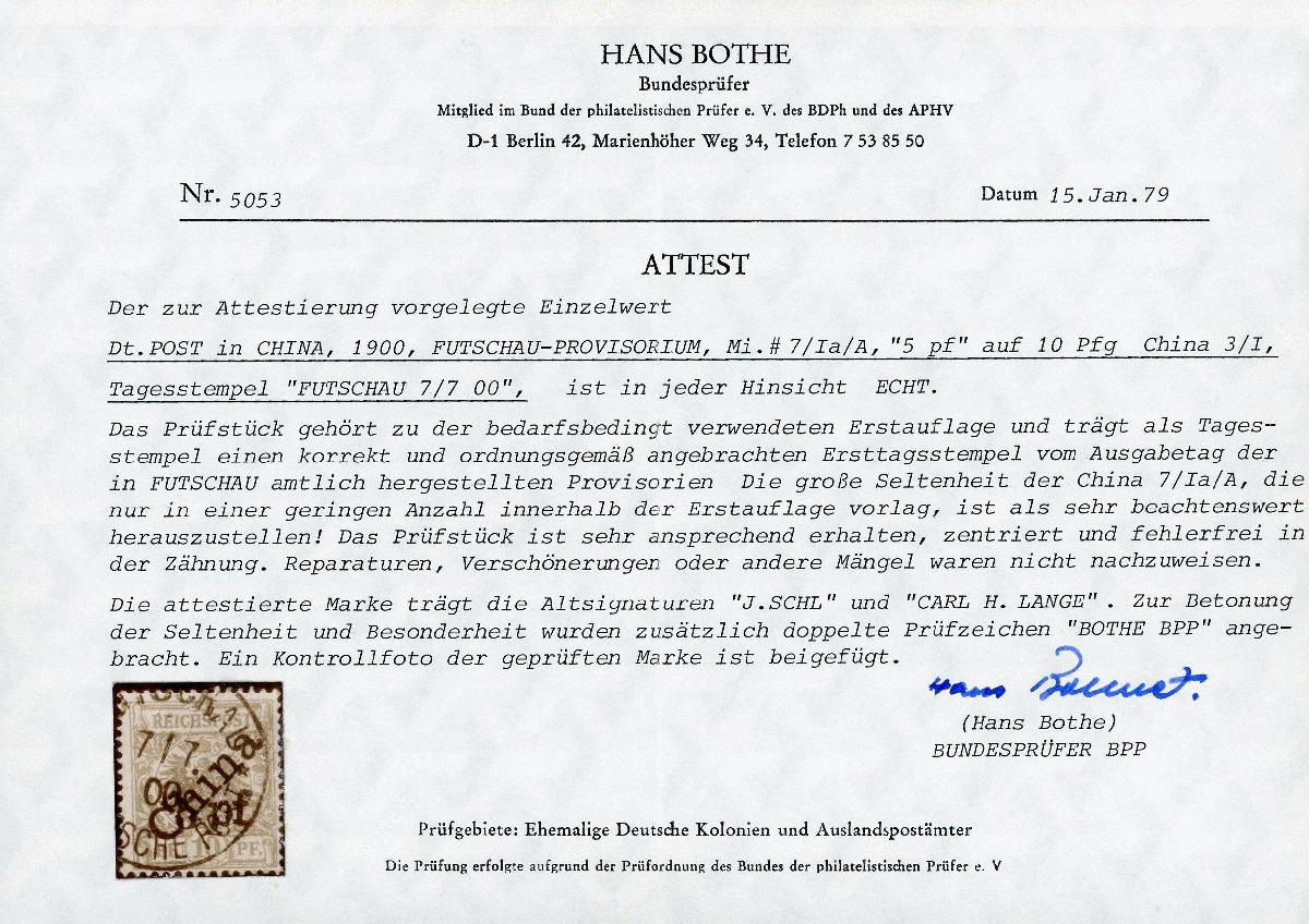 | Zusatzinformationen und Suchstichworte: | Wilhelm Sellschopp – Webshop Los 248 Deutsche Auslandspost China Futschau-Provisorium 5pf auf 10Pf. Erstauflage klar gestempelt "FUTSCHAU 7/7 00", fehlerfrei. FA Bothe. Aus Umzugsangebot abzgl. 10% Rabatt. Festpreis 4.400,00 EUR |