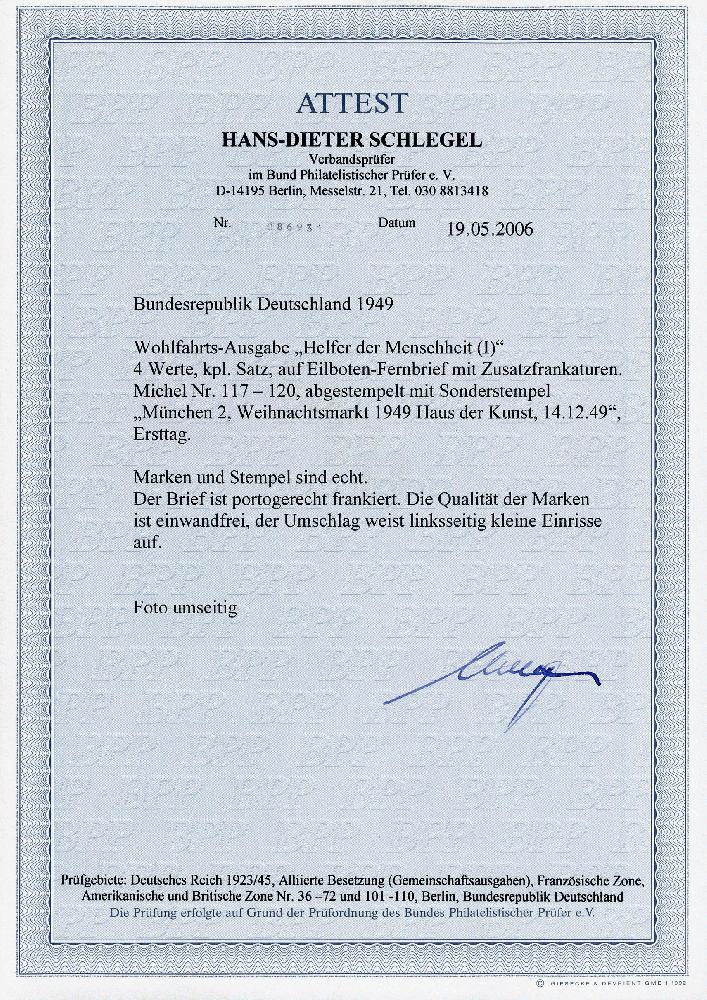 | Zusatzinformationen und Suchstichworte: | Wilhelm Sellschopp – Webshop Los 502 Bundesrepublik Deutschland Wohlfahrt 1949 auf Ersttagsbrief mit Sonderstempel vom 14.12.49, einwandfrei. FA Schlegel. Festpreis 990,00 EUR |