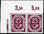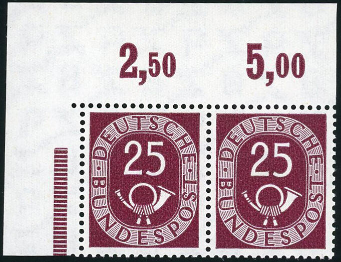 | Zusatzinformationen und Suchstichworte: | Wilhelm Sellschopp – Webshop Los 473 Bundesrepublik Deutschland 25 Pf. Posthorn waagerechtes Eckrandpaar links oben, einwandfrei postfrsch. Luxus! FB Schlegel. Aus Umzugsangebot abzgl. 10% Rabatt. Festpreis 400,00 EUR |