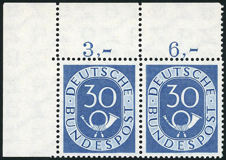 | Zusatzinformationen und Suchstichworte: | Wilhelm Sellschopp – Webshop Los 474 Bundesrepublik Deutschland 30 Pf. Posthorn waagerechtes Eckrandpaar links oben, einwandfrei postfrisch. Luxus! Aus Umzugsangebot abzgl. 10% Rabatt. Festpreis 240,00 EUR |