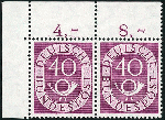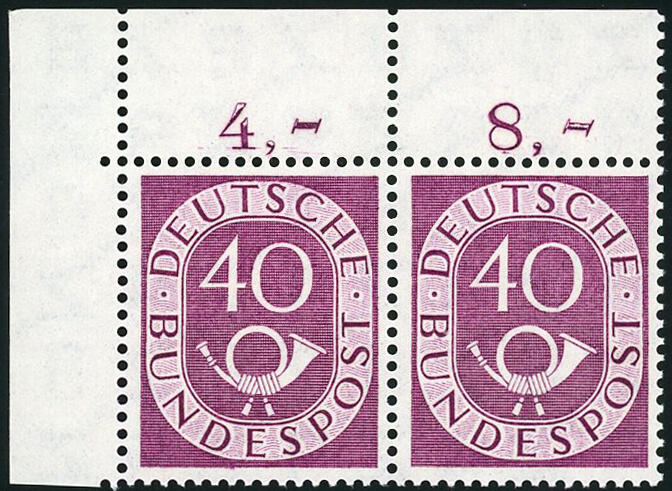 | Zusatzinformationen und Suchstichworte: | Wilhelm Sellschopp – Webshop Los 475 Bundesrepublik Deutschland 40 Pf. Posthorn waagerechtes Eckrandpaar links oben, einwandfrei postfrisch. Luxus! Aus Umzugsangebot abzgl. 10% Rabatt. Festpreis 550,00 EUR |