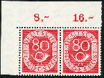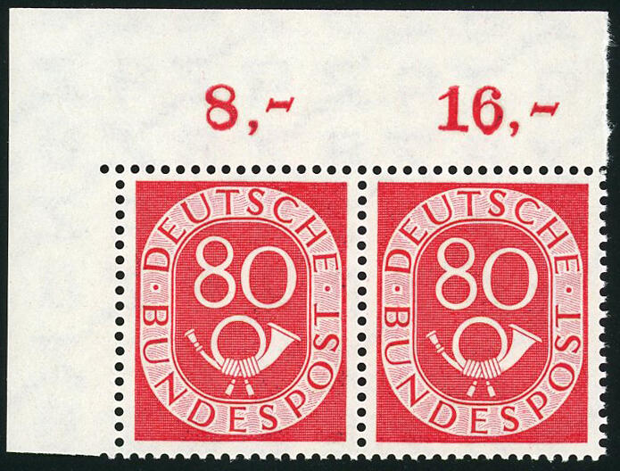 | Zusatzinformationen und Suchstichworte: | Wilhelm Sellschopp – Webshop Los 269 Bundesrepublik Deutschland 80Pf. Posthorn, waagerechter Eckrandpaar links oben, einwandfrei postfrisch. Luxus! FA Schlegel. Aus Umzugsangebot abzgl. 10% Rabatt. Festpreis 2.200,00 EUR |