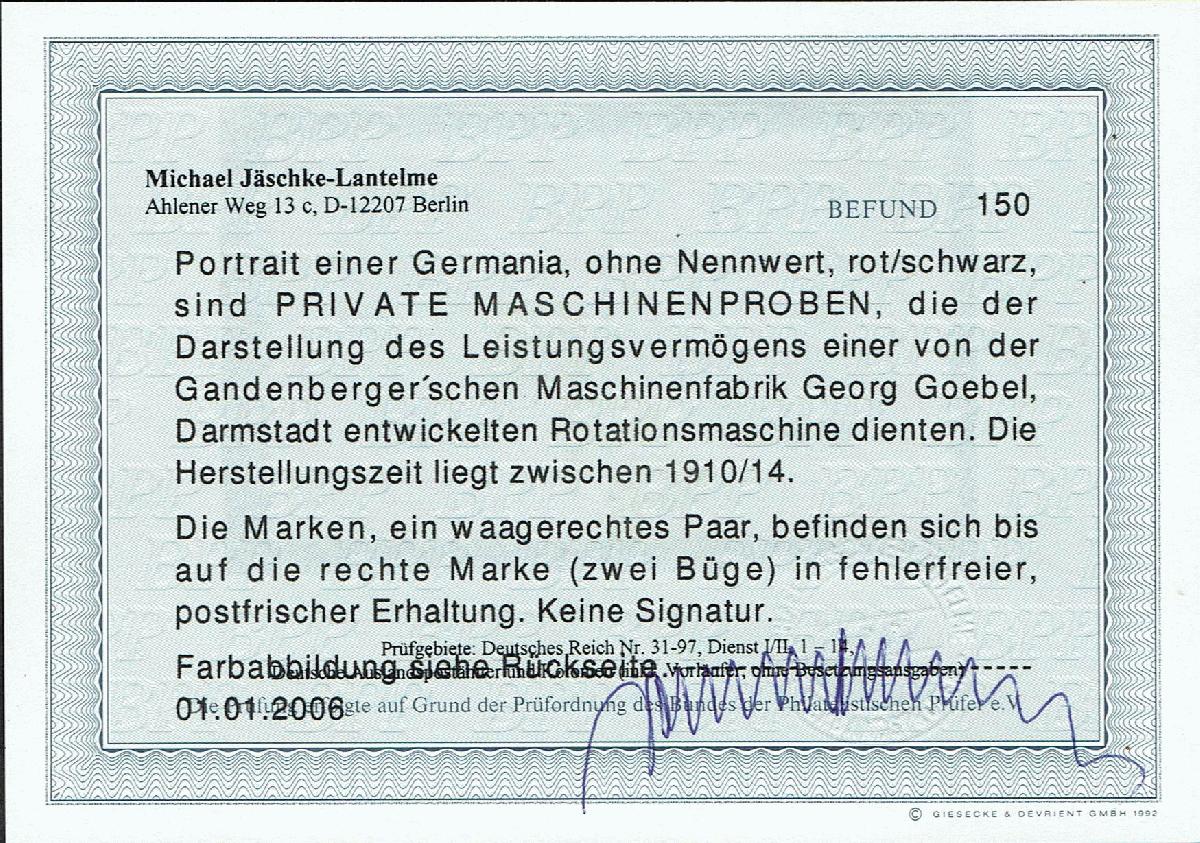 | Prüfgebiet: | Deutsches Reich Specimen, Probedrucke, Essay, Maschinenprobe |