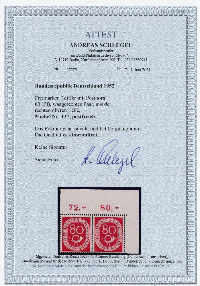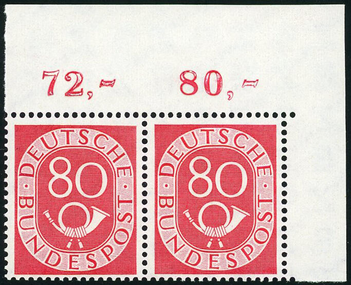 | Zusatzinformationen und Suchstichworte: | Wilhelm Sellschopp – Webshop Los 270 Bundesrepublik Deutschland 80Pf. Posthorn, waagerechtes Eckrandpaar rechts oben, einwandfrei postfrisch. Luxus! FA Schlegel. Aus Umzugsangebot abzgl. 10% Rabatt. Festpreis 2.200,00 EUR |