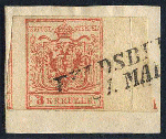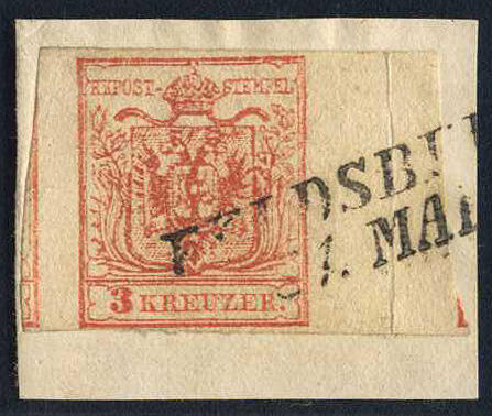 | Zusatzinformationen und Suchstichworte: | Merkurphila 54. Auktion 23. - 24. Juni 2023 Los 54 Österreich Ausgabe 1850 Österreich, 1850, Nr 3 H III a mit rechts ANHÄNGENDER BOGENMITTE und kleinem Eckteil der Marke des benachbarten Druckbogenviertels auf Originalbriefstück, links ist die Marke ebenso überrandig, oben und unten lupen bis vollrandig, entwertet mit zartklarem Teilstempel 'FELDSBER(G) 31.MAI', Marke und Briefstück sind in frischer und naturbelassener Prachterhaltung, ein philatelistisches AUSNAHMESTÜCK mit äußerstem SELTENHEITSCHARAKTER! Attest Mag.Babor Ausruf 400,00 EUR |
