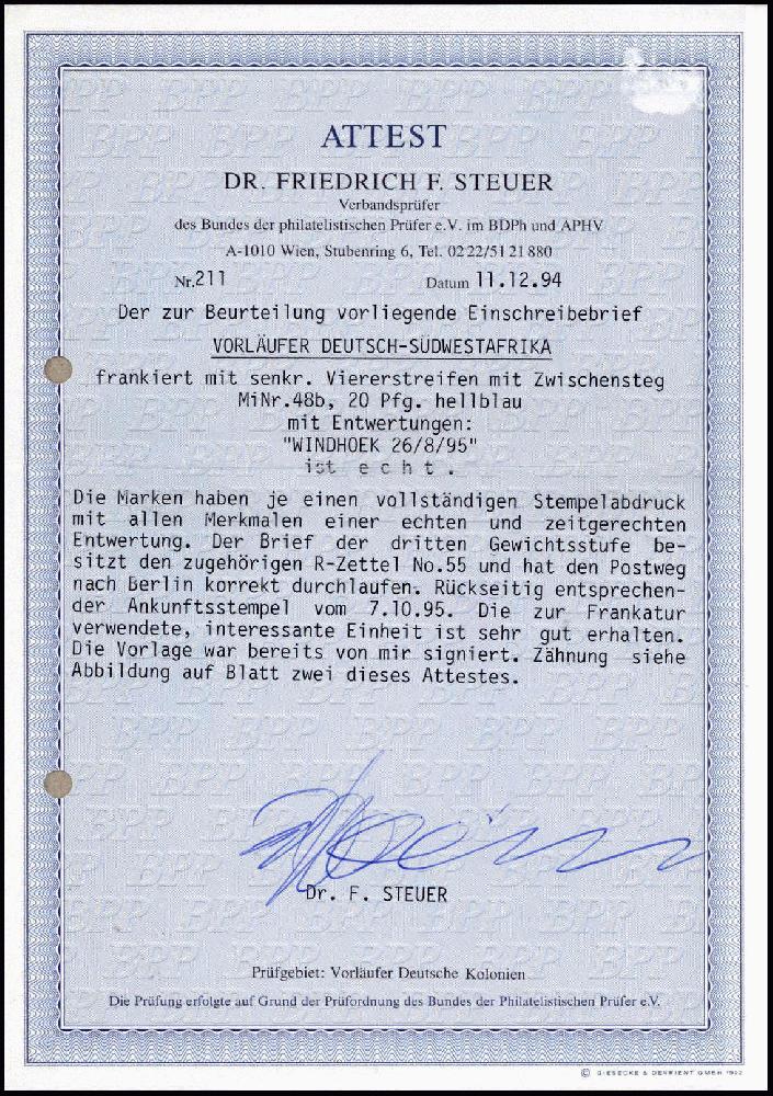 | Zusatzinformationen und Suchstichworte: | Württembergisches Auktionshaus 142. Versteigerung 24. Juni 2023 Los 15 + Deutsche Kolonien Südwestafrika, Vorläufer Viererstreifen mit Zwischensteg: 20 Pfg., besonders farbfrischer und tadelloser, senkr. Viererstreifen, dabei die beiden oberen Marken mit Zwischensteg, auf schönem Einschreibebrief (R-Zettel als Bogenecke) nach Berlin, jede Marke mit Stempel WINDHOEK 26/8 95 versehen. Einer der wenigen bekannten Vorläuferbriefe mit Zwischensteg-Frankatur, Fotoattest Dr.Steuer BPP. Ausruf 400,00 EUR |
