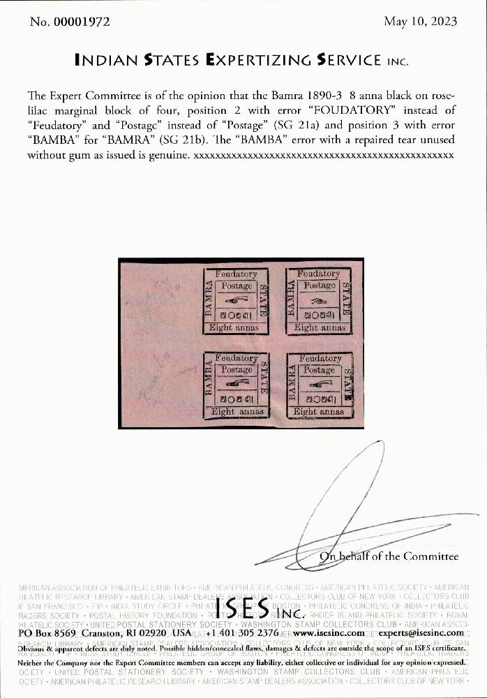 | Zusatzinformationen und Suchstichworte: | India and States Auction 25. Juni 2023 Los 6 Indien Staaten Bamra Bamra 1890-3 8 anna schwarz auf rosalila Randviererblock, Position 2 mit Fehler "FOUDATORY" statt "Feudatory" und "Postagc" statt "Porto" (SG 21a) und Position 3 mit Fehler "BAMBA" für "BAMRA" (SG 21b). Die "BAMBA" Fehler mit ein reparierter Riss ungebraucht ohne Gummi, wie verausgabt. ISES Attest Zuschlag 600,00 USD |