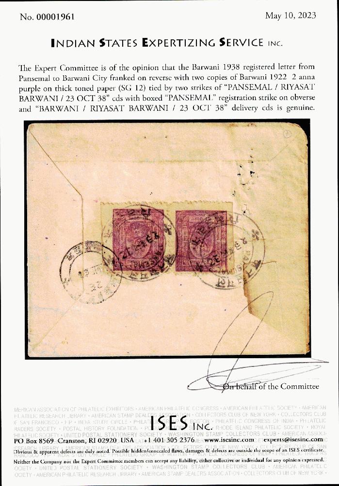 | Zusatzinformationen und Suchstichworte: | India and States Auction 25. Juni 2023 Los 7 Indien Staaten Barwani Barwani 1938 eingeschriebener Brief ab Pansemal zu Barwani Stadt frankiert auf der Rückseite mit zwei Exemplaren von Barwani 1922 2 anna purpur auf dick getönt Papier (SG 12) zwei übergehende Abschläge von "PANSEMAL/RIYASAT BARWANI/23 OCT 38" Kreisdatumsstempel mit gerahmtem "PANSEMAL" Einschreiben Abschlag auf der Vorderseite und "BARWANI/RIYASAT BARWANI/23 OCT 38" Ablieferung Kreisdatumsstempel. ISES Attest Ausruf 250,00 USD |