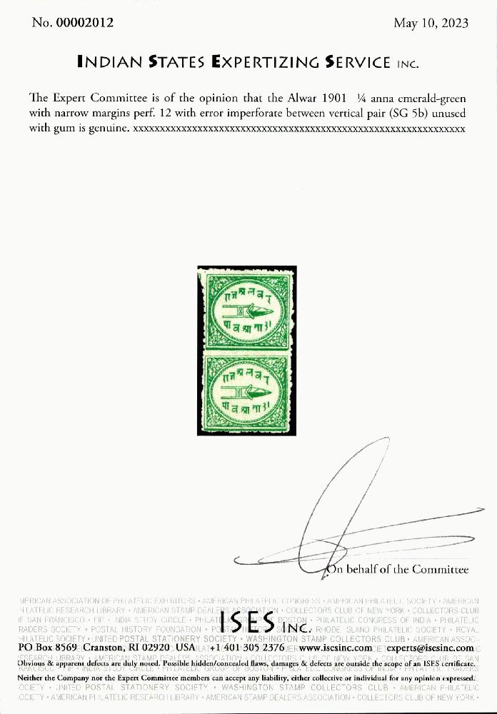| Zusatzinformationen und Suchstichworte: | India and States Auction 25. Juni 2023 Los 2 Indien Staaten Alwar Alwar 1901 ¼ anna smaragdgrün schmalrandig Zähnung 12 mit Fehler zwischen den Marken ungezähnt senkrechtes Paar (SG 5b) ungebraucht kleiner Falz. ISES Attest Zuschlag 425,00 USD |