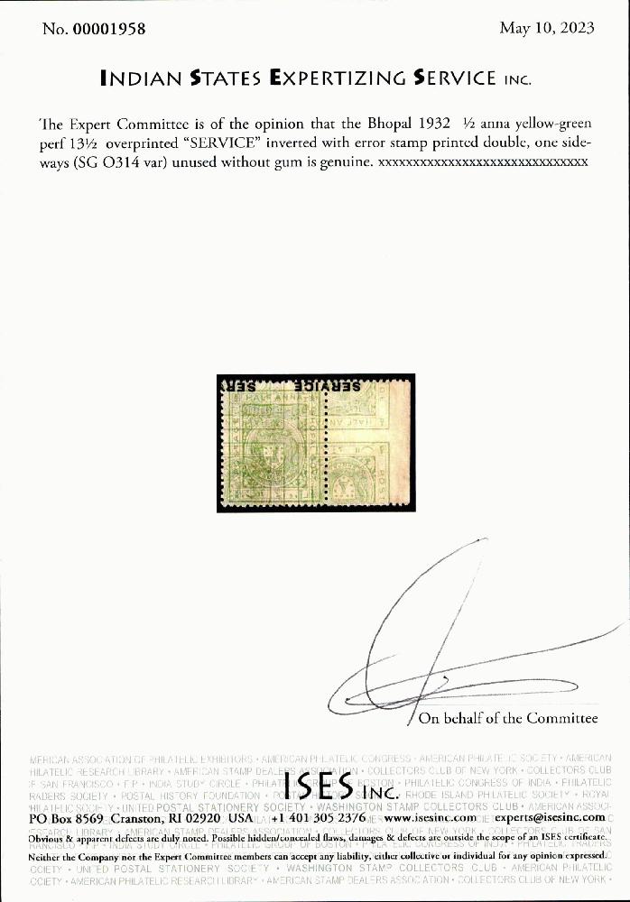 | Zusatzinformationen und Suchstichworte: | India and States Auction 25. Juni 2023 Los 20 Indien Staaten Bhopal Bhopal 1932 ½ anna gelbgrün gezähnt 13½ überdruckt "Dienst" kopfstehend mit Abart Doppeldruck, ein seitlich (SG O314 var) ungebraucht ohne Gummi. ISES Attest Ausruf 50,00 USD |