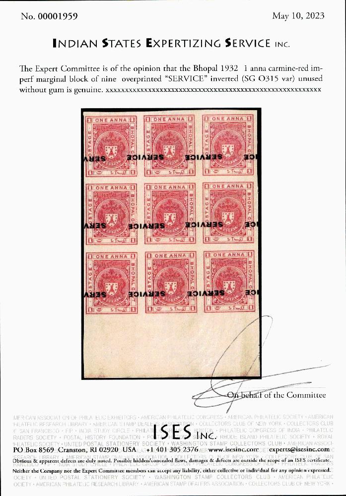 | Zusatzinformationen und Suchstichworte: | India and States Auction 25. Juni 2023 Los 22 Indien Staaten Bhopal Bhopal 1932 1 anna karminrot ungezähnt Randneunerblock überdruckt "Dienst" kopfstehend (SG O315 var) ungebraucht ohne Gummi. ISES Attest Ausruf 50,00 USD |