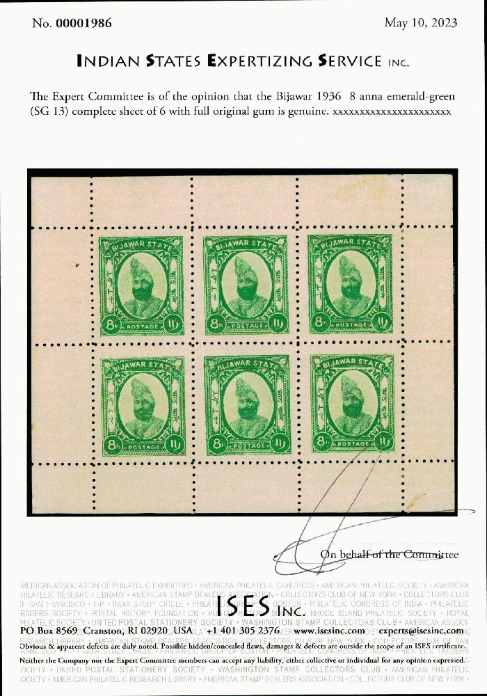 | Zusatzinformationen und Suchstichworte: | India and States Auction 25. Juni 2023 Los 30 Indien Staaten Bijawar Bijawar 1936 8 anna smaragdgrün (SG 13) Komplettbogen von 6. Falz auf Seitenrand, Marken postfrisch ohne Falz. Katalogwert £226 als Einzelmarken. ISES Attest Ausruf 200,00 USD |