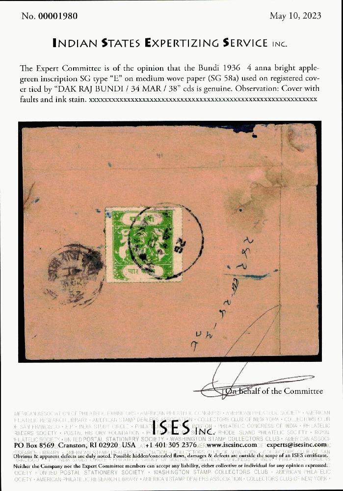 | Zusatzinformationen und Suchstichworte: | India and States Auction 25. Juni 2023 Los 36 Indien Staaten Bundi Bundi 1936 4 anna leuchtend apfelgrün Aufschrift SG Typ "E" auf mittlerem genetztem Papier (SG 58a) verwendet auf Einschreibebrief entwertet mit "DAK RAJ BUNDI/34 MAR/38" Kreisdatumsstempel, Brief mit Fehlern und Tintenfleck. ISES Attest Ausruf 600,00 USD |