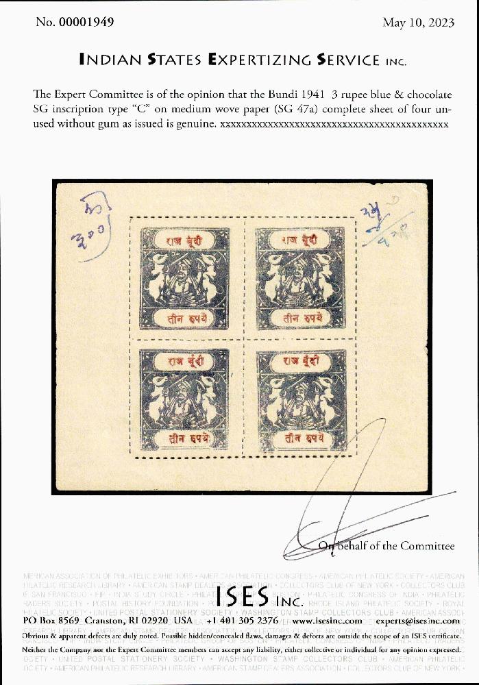 | Zusatzinformationen und Suchstichworte: | India and States Auction 25. Juni 2023 Los 38 Indien Staaten Bundi Bundi 1941 3 Rupien blau und Schokolade SG Aufschrift Typ "C" auf mittlerem genetztem Papier (SG 47a) komplett Viererbogen ungebraucht ohne Gummi, wie verausgabt. Handschriftlich Anmerkung auf gerandet nicht die Marken berührend. ISES Attest Ausruf 300,00 USD |