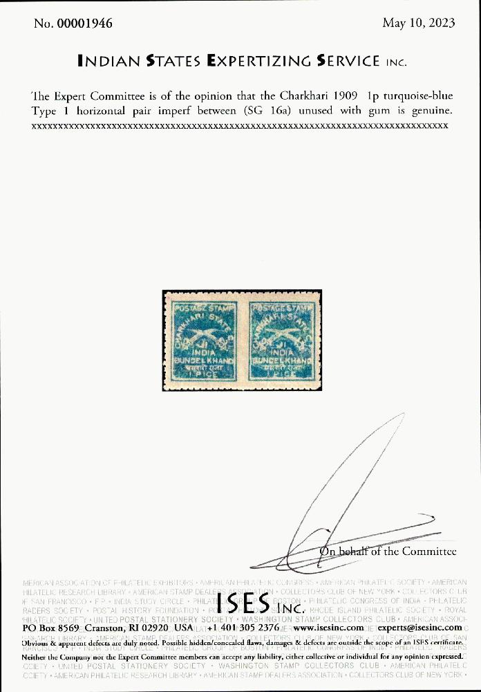 | Zusatzinformationen und Suchstichworte: | India and States Auction 25. Juni 2023 Los 51 Indien Staaten Charkhari Charkhari 1909 1p turquoise-blue Typ 1 in der Mitte ungezähntes waagrechtes Paar (SG 16a) ungebraucht mit Gummi. ISES Attest Ausruf 150,00 USD |